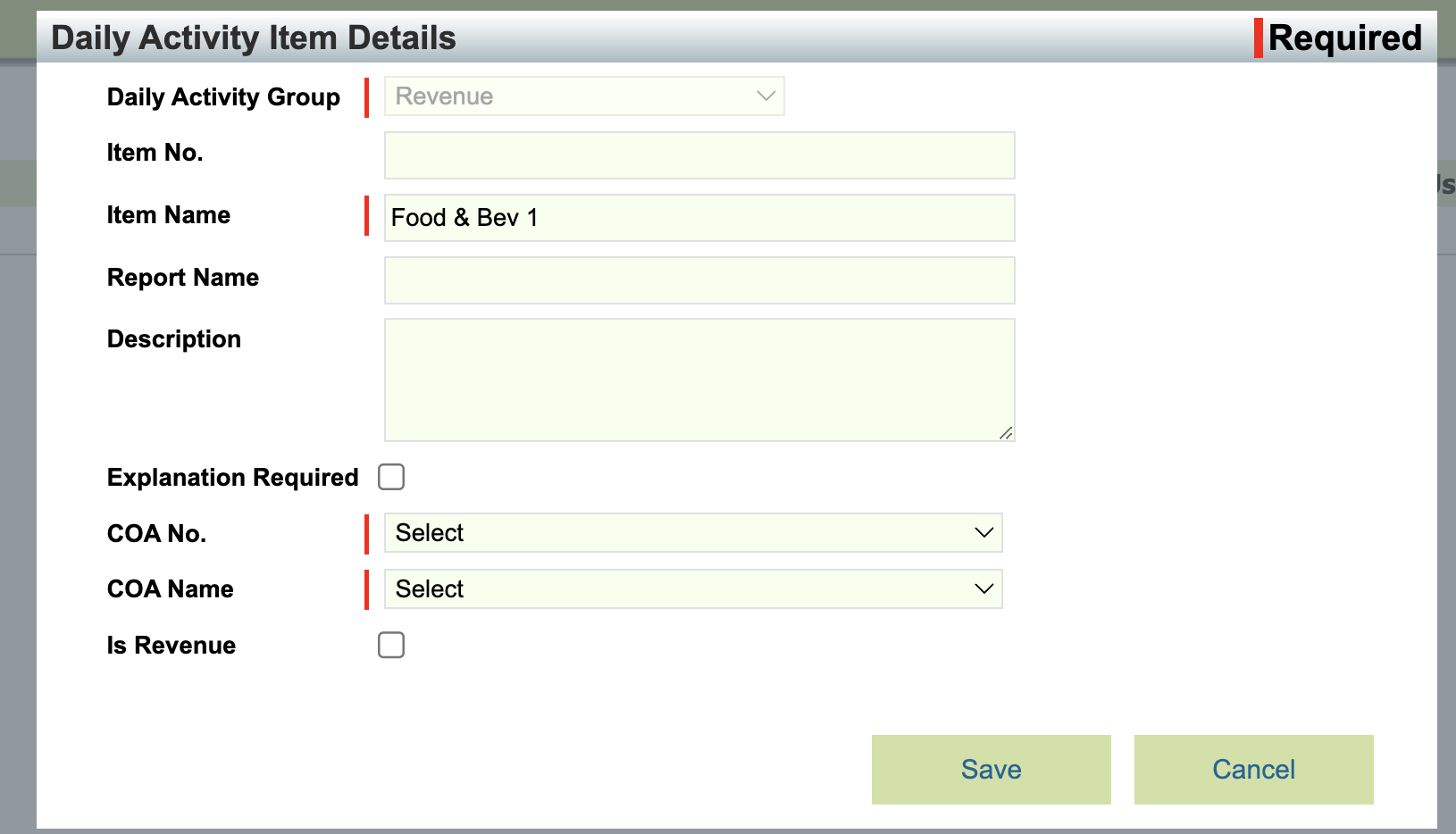 - Note: Items in the Payment Daily Activity Group will be limited to only Payment type COA's such as Cash & Checks, Visa, or Wire Transfer, or a Liability COA. Expense or Revenue COA's cannot be utilized for an item within the Payments section.