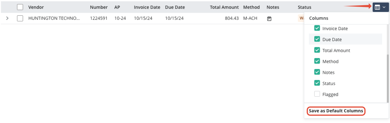 You can customize columns by selecting or removing options using the column selector. Common additions include Due Date and Status. Once you have set your columns to the items you prefer, click Save as Default Columns, so that next time you visit the Invoice Approval Page, you'll see the same view.