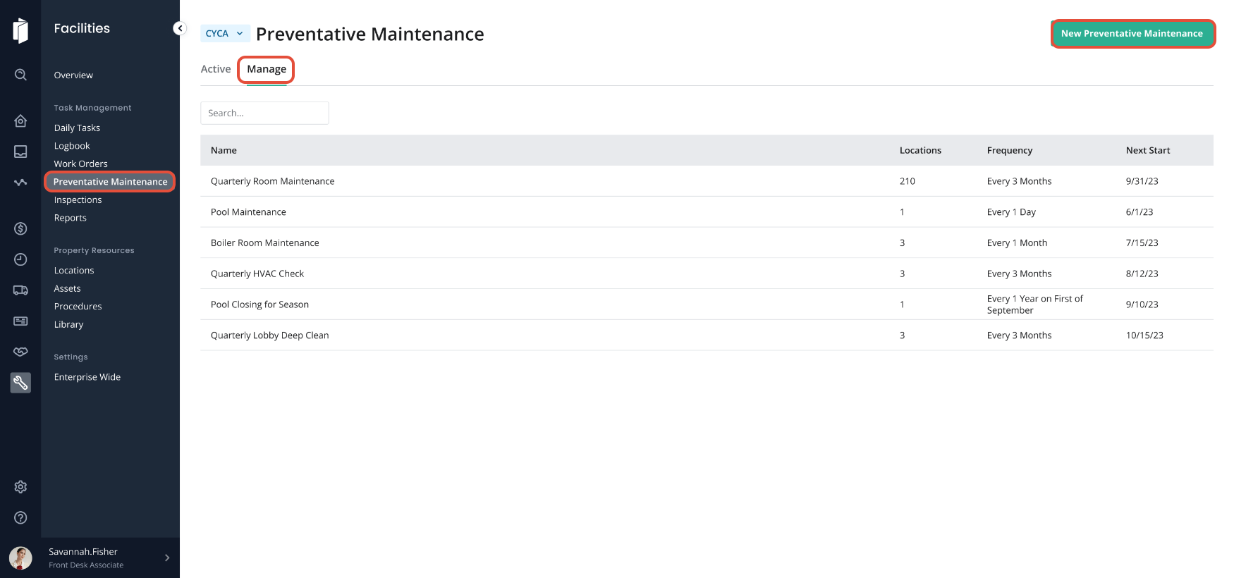 To begin a New Preventative Maintenance schedule, navigate to the Manage tab, and click on New Preventative Maintenance.