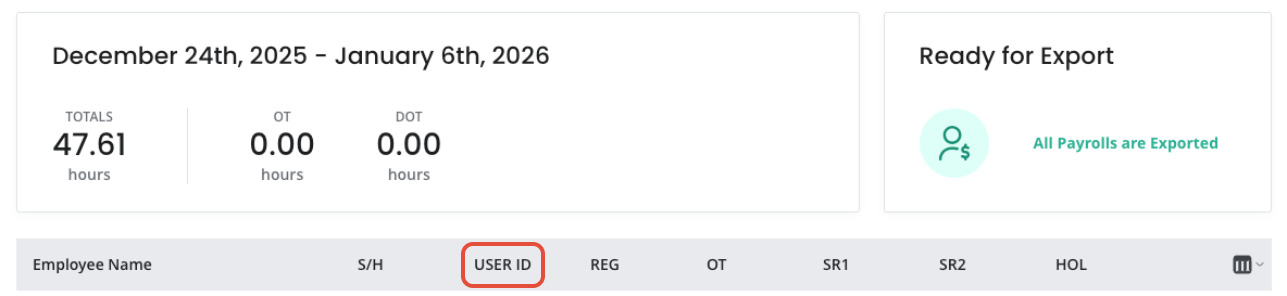 Renamed the “Employee No.” column to User ID across the Users page, column selector, exports, and the Payroll page to ensure consistent terminology throughout the application.