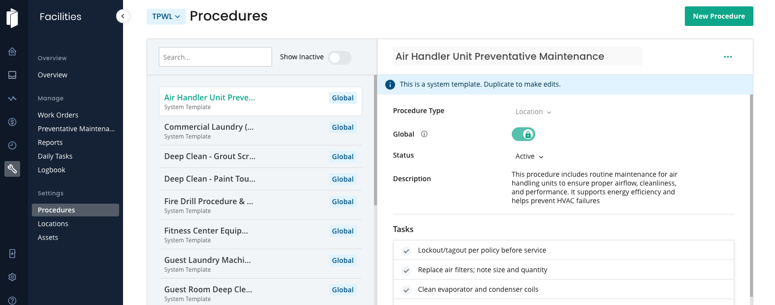 We've introduced System Templates in the Procedure Library, launching with 12 pre-populated procedure templates. Templates can be duplicated and customized at either the EHID level or organization-wide, helping teams standardize procedures more quickly. For more information on this feature, see article: Procedures: System Templates