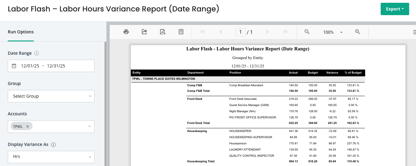 You can now run the Labor Flash – Labor Hours Variance Report across a date range of up to 31 days, giving you a clearer view of how actual labor hours trend against budget over time.