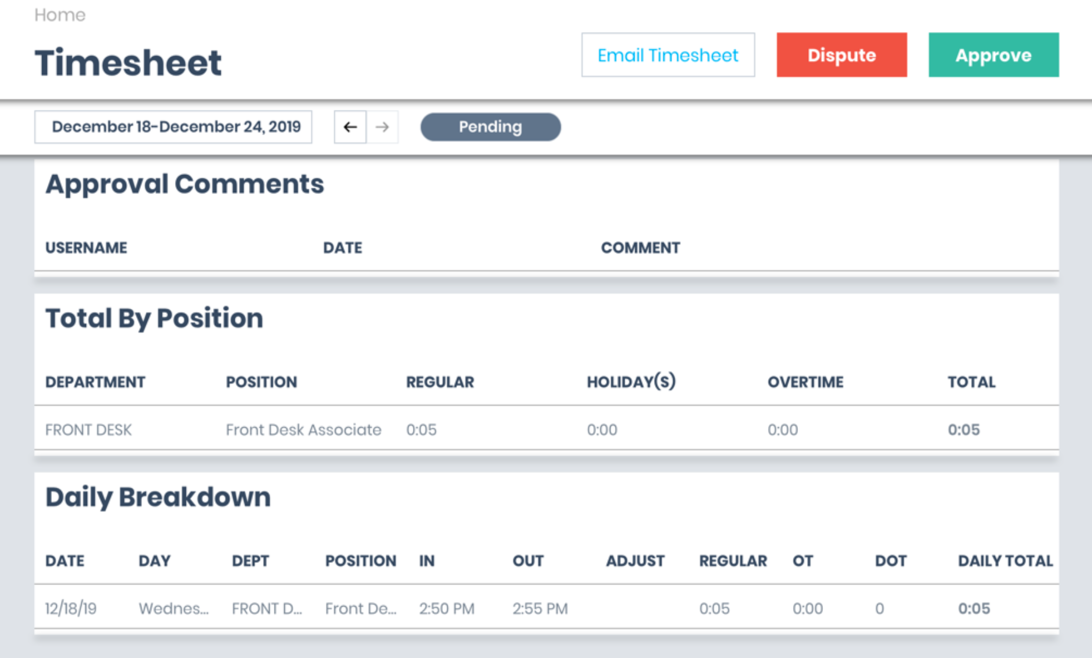 This gives employees ongoing visibility into their time and an opportunity to raise concerns before payroll is finalized.