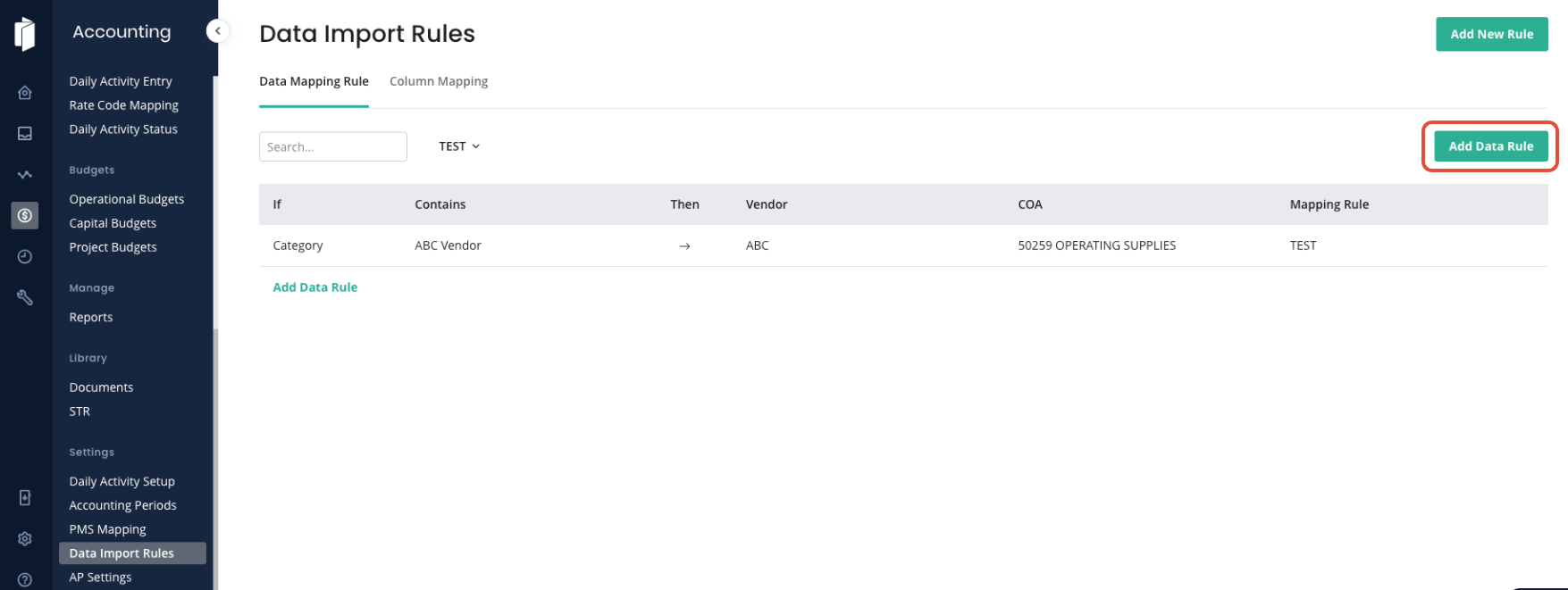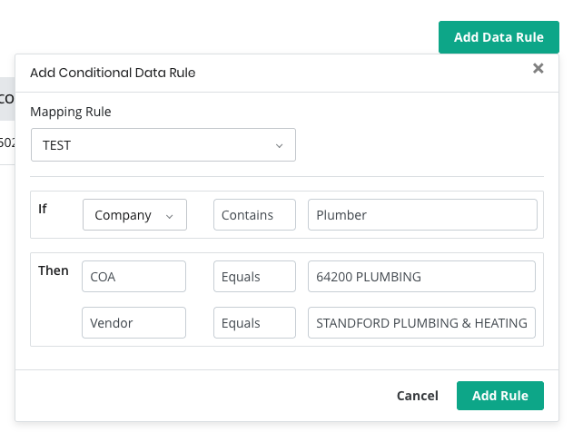 Note: You do not have to select both a COA and a Vendor within data rules. You are able to map a keyword to only a vendor if the COA may change each transaction. Also, you can map a COA but not a Vendor if the vendor may change. It is not a requirement to map both.