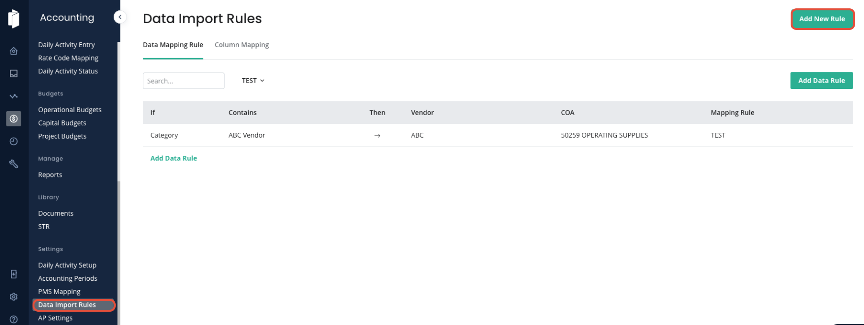 In the top right corner, click Add New Rule. This creates a Mapping Rule, which is the first step to configure the import for your Credit Card statement. For Example, you would want to set up an Amex Rule, and a Chase Rule if you have two types of cards, with two statements that are formatted differently.