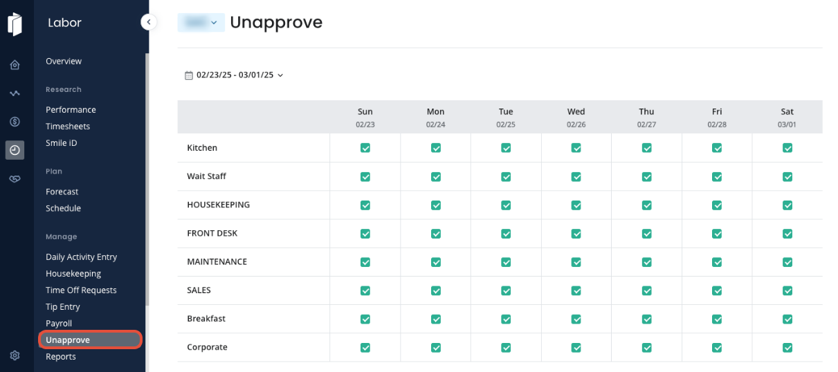 Step 1: You'll need to Unapprove any dates or departments that need updates. You will not be able to update any Timesheet if the day/department is approved. Navigate to Labor Management > Unapprove, and deselect the necessary boxes.