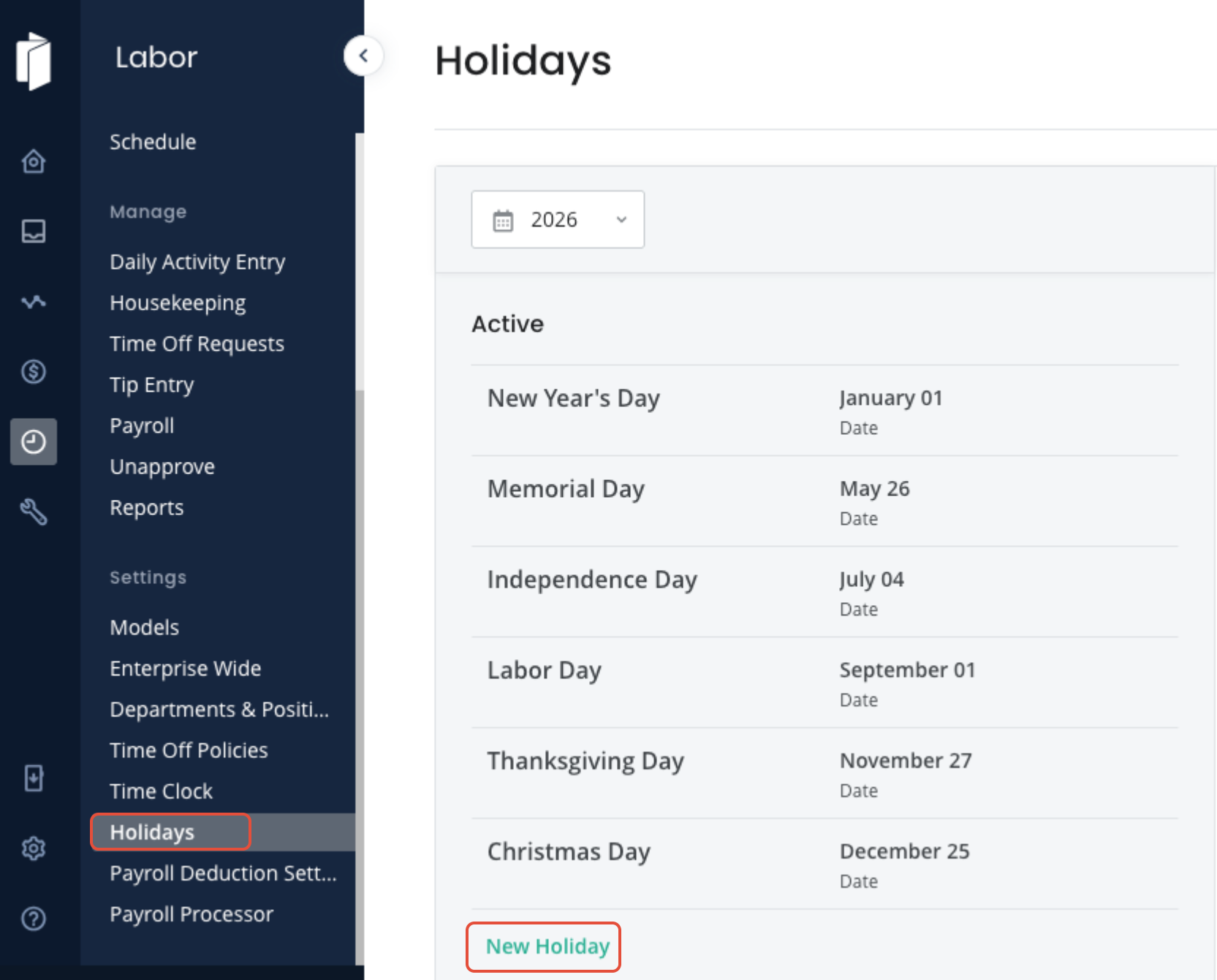 Step 2: Navigate to Labor Management > Holidays. Add the Holiday as necessary, using the steps outlined in this article: Holidays.